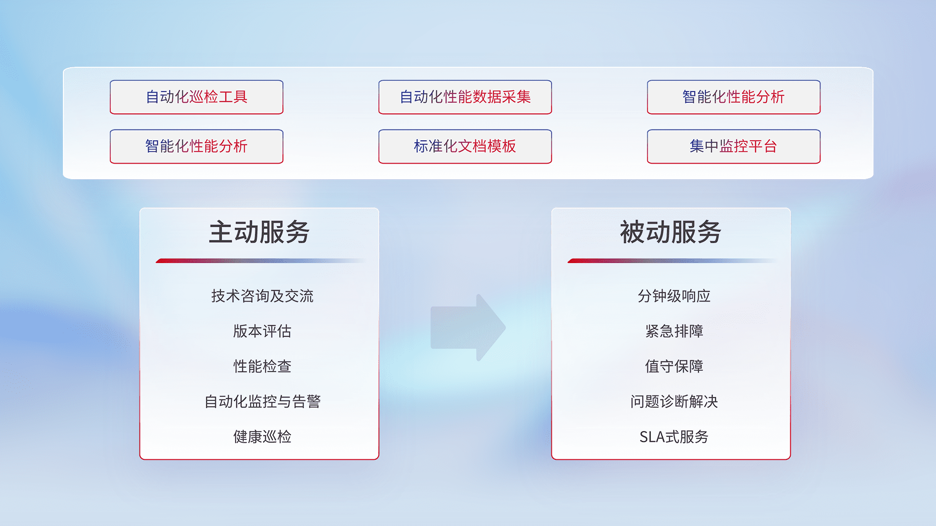 智能化工具和标准化文档,,,,保障服务质量,,提供主动服务(包含技术咨询、、、版本评估、、、性能检查、、、自动化监控与告警、、、健康巡检)和被动服务包含(分钟级响应、、、紧急排障、、、值守保障、、、、问题诊断解决、、SLA服务)。。。